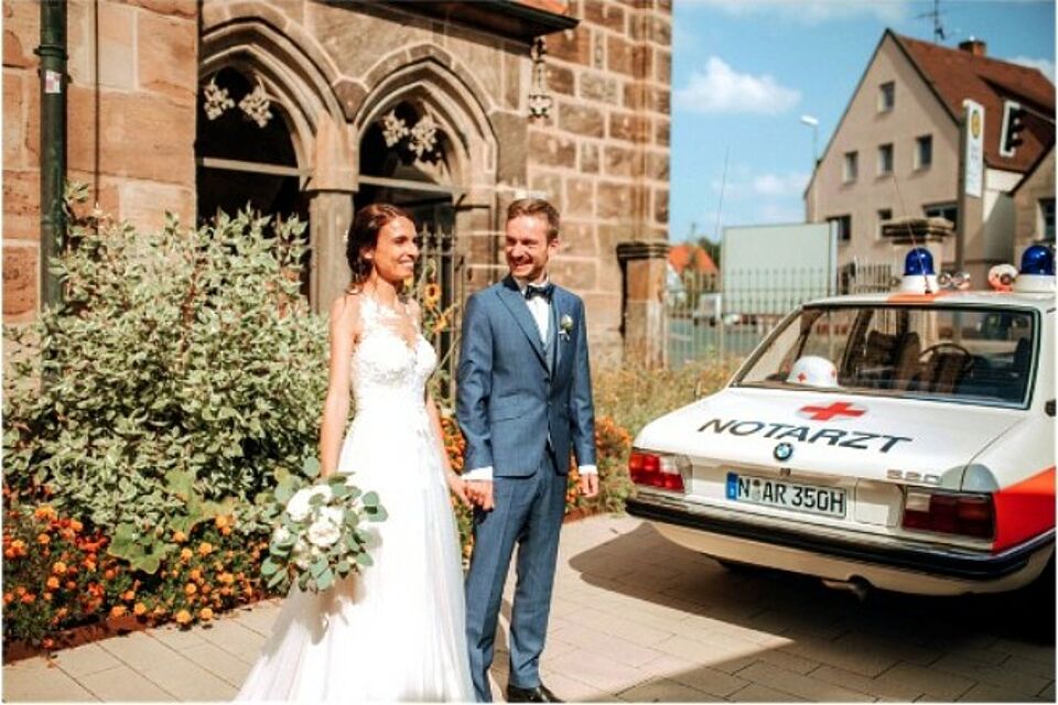 Hochzeitsfahrt September 2021 mit unserem Museums-Oldtimer BMW 520/4 E12 NEF. Eine originalgetreue Replik des ersten in Bayern in Dienst gestellten Exemplars, des „Äskulap Nürnberg 12“.